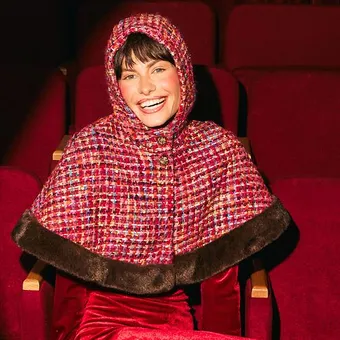 Еще один большой тренд – кейпы. Яркие и почти декоративные, теплые и меховые – все кейпы сейчас актуальны. Поэтому вряд ли кто-то сможет устоять перед этой пестрой кукольной моделью с меховой оторочкой.