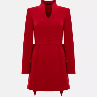 Один только бант стоит того, чтобы срочно примерить это эффектное алое платье. В нем волшебным образом органично скомбинировалось несколько мощных тенденций праздничного сезона: воротник-стойка, как у ципао, насыщенный красный цвет, банты и чувственный вырез на спине.