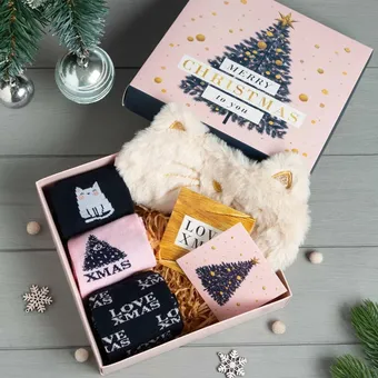 Стильный комплект станет замечательным сюрпризом для любой девушки, поскольку сочетает практичность и уют. В чулке для подарка будут отлично смотреться мягкие носки, которые создадут комфорт и тепло в холодное время года, и удобная маска для сна, обеспечивающая полноценный отдых и расслабление. А еще набор подойдет для пижамной вечеринки или хоум-пати.