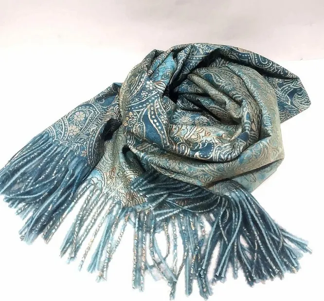 Палантины универсальны: можно носить их как шарф или накидывать на голову, драпироваться в них поверх летнего платья или кутаться на ветру. Предлагаем обратить внимание на эту модель нежного бирюзового оттенка с золотистым узором. Выполненное из 100% кашемира изделие исключительно приятно на ощупь, отлично драпируется и хорошо согревает в прохладную погоду.