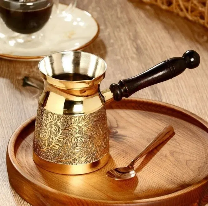Медная турка объемом 300 мл – отличный подарок для тех, кто предпочитает наслаждаться кофе в одиночестве. Внутренняя поверхность имеет безопасное оловянное покрытие для равномерного прогрева, а внешняя украшена красивым орнаментом. Турку классической формы можно использовать на любой плите, кроме индукционной.