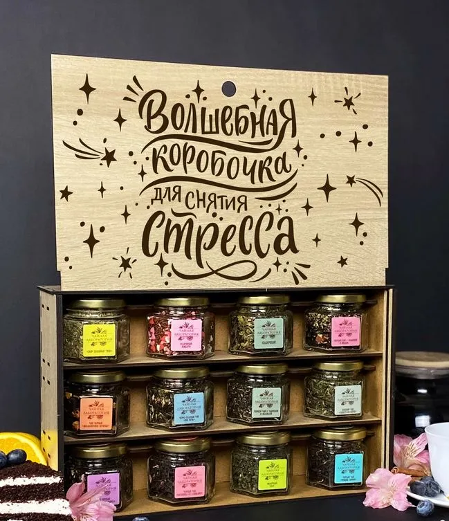Красивая деревянная коробка содержит 12 баночек с разными сортами чая – от классических листовых до оригинальных травяных и чайно-фруктовых блендов. Каждая разновидность – маленькое гастрономическое привлючение, наслаждение вкусом и ароматом. Кстати, коробку и баночки в дальнейшем удобно использовать для хранения всевозможных мелочей, но это потом, а пока стоит заварить чашечку ароматного чая и получить удовольствие от этого стильного и полезного подарка.