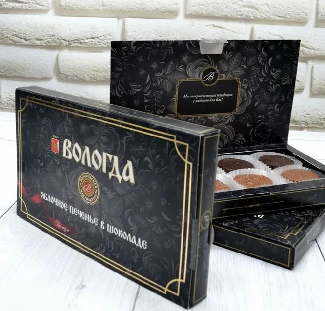 Натуральное, вкусное, без искусственных добавок и ароматизаторов – именно таким должно быть идеальное печенье. Аромат антоновки, корицы и шоколада сводит с ума. В каждой коробке лакомство представлено в двух вариантах – в молочном или горьком шоколаде.