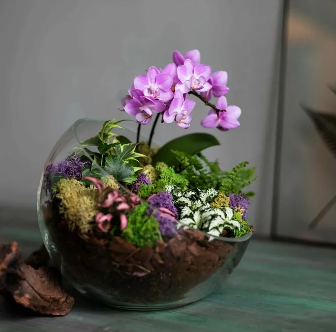 Флорариум с мини-орхидеей станет украшением любой квартиры. Благодаря компактному размеру его можно разместить и на рабочем столе и на тумбочке около кровати. Цветущий подарок для мамы будет радовать ее долго-долго, если обеспечить растениям хорошие условия.