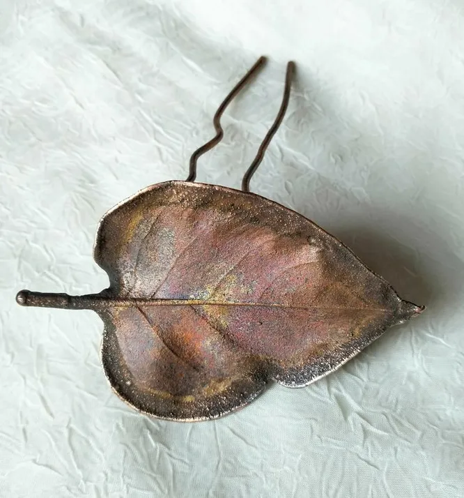 Этот аксессуар украсит любую прическу, придав ей изысканный и стильный вид. Медная шпилька украшена крупным листом размером с ладонь. Достаточно просто свернуть волосы в пучок и зафиксировать с помощью заколки, чтобы создать интересную и неповторимую прическу. Отличный вариант для тех, кто ищет подарок ручной работы для любимой мамы.