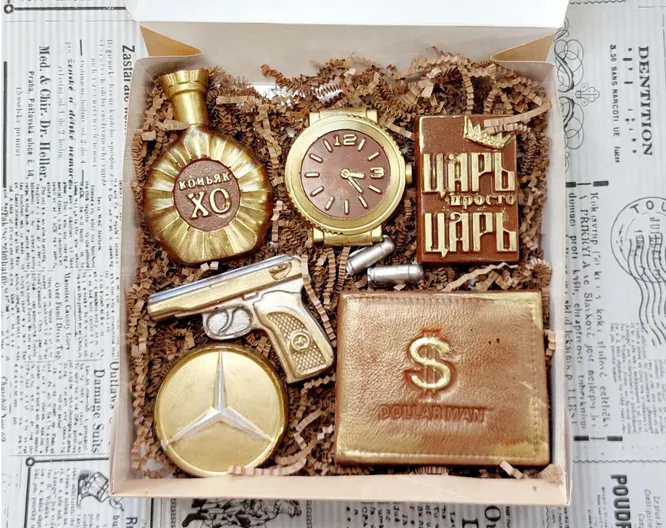 Если нужно дополнение к основному презенту или просто хочется порадовать папу-сладкоежку, можно подарить оригинальный набор из нескольких шоколадных фигурок. В симпатичной коробке спрятан вполне «мужской» комплект: портмоне, часы, пистолет и так далее. Вариантов много: фигурки в виде медалей, гаечных ключей, машин и даже пельменей. И каждая выглядит настолько реалистично, что ее жалко есть. Шоколад на любой вкус – темный и молочный.