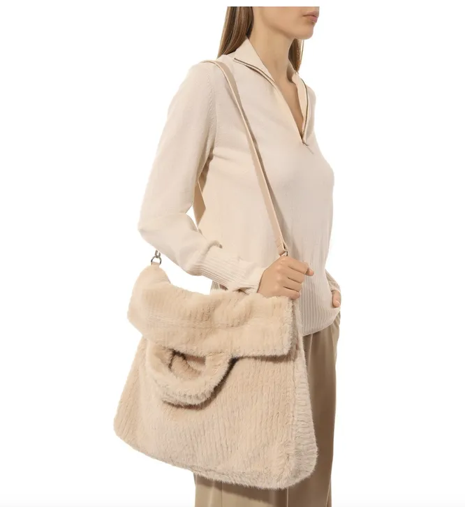 Шопер с двумя короткими ручками и съемным плечевым ремнем изготовили из похожего на мех текстиля с фактурным узором, поэтому он и получился пушистым. В аксессуаре с внутренними карманами хватит места для бумаг формата А4, планшета, зонта и бутылки воды – lady boss оценят.