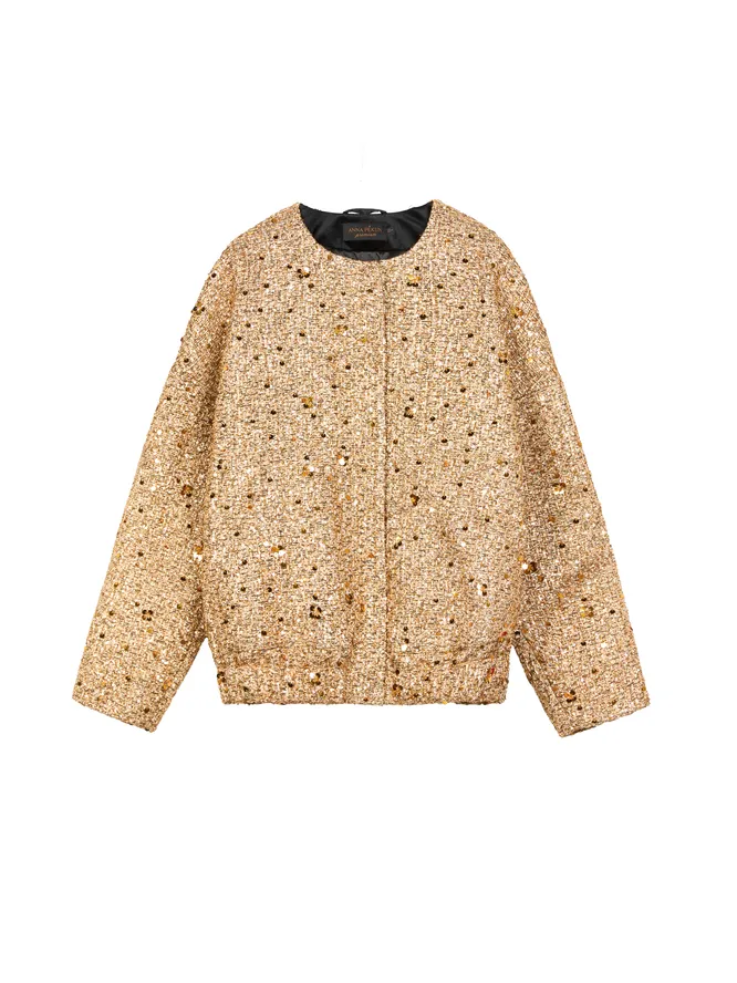 В новогодней коллекции Anna Pekun нам приглянулось примерно все (линейка вдохновлена театральным закулисьем, поэтому у нее просто не было шанса получиться не эффектной). И в зимней капсуле тоже хорошо все! Но золотой бомбер все-таки попал в наш вишлист первым: на вечеринке, в паре с белой майкой и джинсами, на фотосессии – будет отлично смотреться в любом случае.