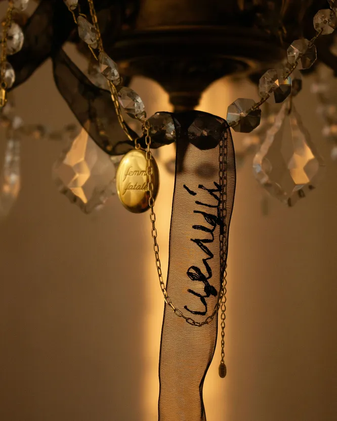 Шалость у бренда ювелирных украшений Mossa и марки аксессуаров ручной работы «Уста к Перстам» удалась! В их коллаборации ты найдешь особые комплекты, собранные для девушек-эстетов. Мы положили глаз на набор с тонкими перчатками (украшены ручной вышивкой), лентой с вышивкой «Целуй» и медальоном с гравировкой Femme Fatale.