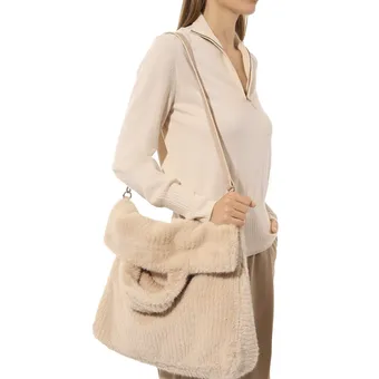 Шопер с двумя короткими ручками и съемным плечевым ремнем изготовили из похожего на мех текстиля с фактурным узором, поэтому он и получился пушистым. В аксессуаре с внутренними карманами хватит места для бумаг формата А4, планшета, зонта и бутылки воды – lady boss оценят.