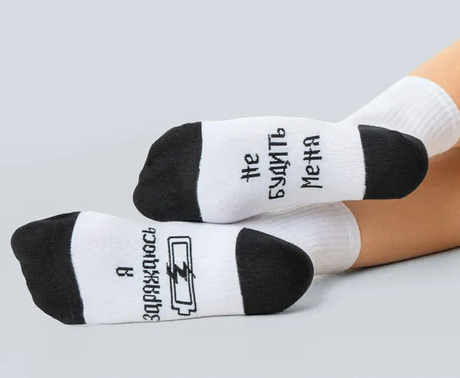 Прикольные фразы, абстрактные понятия, емкие словечки и нечитаемые принты-тексты нашли свое место на всех слоях одежды, добравшись также до обуви и аксессуаров. Иногда они несут смысловую нагрузку, а иногда нет, но футболки, худи и свитшоты без надписей уже считаются моветоном. Дети и подростки также попали под влияние тренда, поэтому подарки из этой категории будут уместны и приняты на ура. Добавить хорошего настроения можно презентом в виде носков с забавной надписью, которые станут стильным акцентом в образе. Обладающие тонким юмором близкие и друзья оценят этот предмет гардероба, и получатель сувенира окажется в центре внимания. Смешные носки можно подобрать для всех членов семьи – отличная идея для фэмили лука к празднику или фотосессии.
