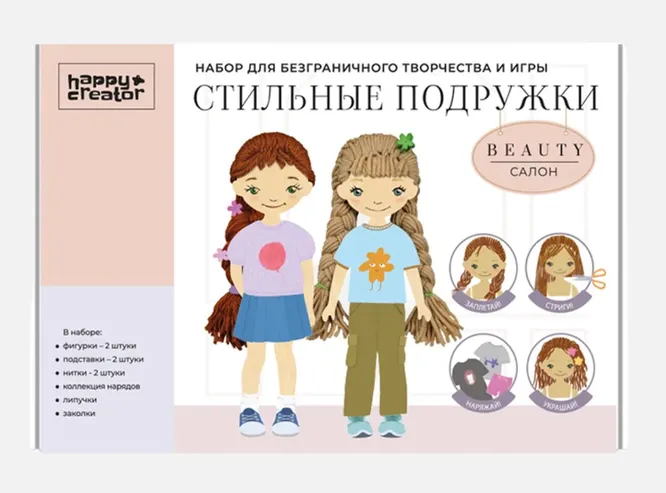 Какая девочка не мечтает примерить на себя роль стилиста и сделать новую прическу любимым куклам? Набор для творчества «Стильные подружки» как раз и создан для этого. Советуем подарить его девочке, которая уже умеет управляться с ножницами, соблюдая осторожность. К деревянным заготовкам кукол прилагаются мотки ниток для «наращивания» волос, а также заколки и резинки для создания модных причесок, коллекция бумажной одежды, трафареты, липучки и другие аксессуары. Здорово играть в набор с мамой или подружкой, устраивая показ мод, придумывая прически и стильные наряды.