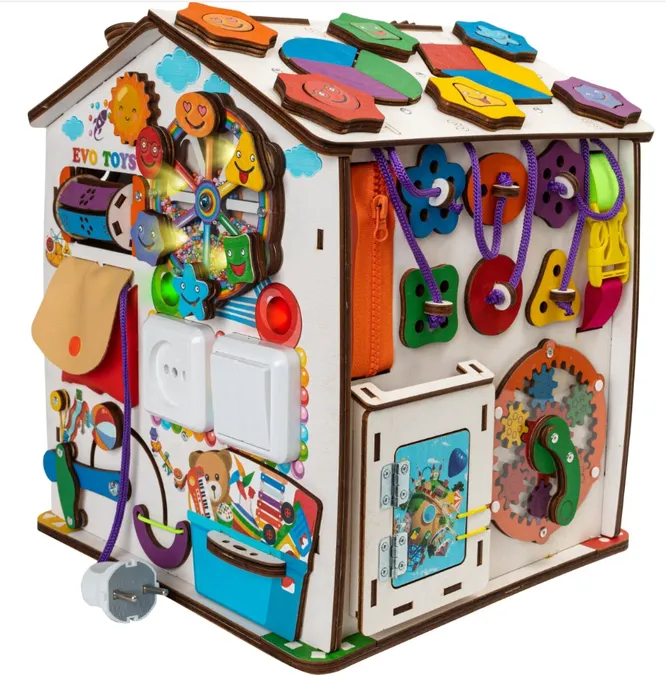 Производители решили, что одной занимательной доски (так переводится бизиборд – от английского busy board) малышам для развития мало. И создали целый домик, позволяющий крохе изучать разные бытовые объекты. На его стенах и крыше есть щеколды, выключатели, розетки, замки, прищепки, шнуровка, лабиринты, сортеры и липучки. Домик делает знакомство с этими и многими другими привычными для взрослых приспособлениями безопасным и удовлетворяет интерес ребенка, который познает мир и хочет все, как у мамы и папы. А спустя время игрушка превратится в кукольный дом с подсветкой и настоящим почтовым ящиком.