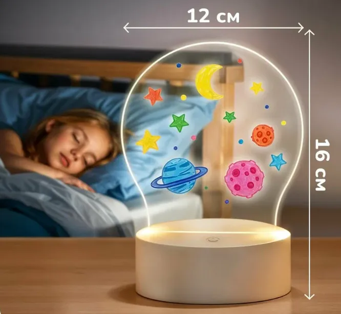 Готовые наборы для творчества помогают ребенку развивать мелкую моторику рук, художественные способности и правильный эстетический вкус. Детям нравится создавать что-то своими руками, они стараются и ждут похвалы, а потом эти предметы становятся кладезем воспоминаний и семейными реликвиями. На день рождения, Новый год или 8 Марта девочке можно подарить ночник, который послужит и планшетом для рисования, и декором для комнаты. Каждый вечер юная леди сможет засыпать, глядя на новое изображение – плод своей фантазии, мерцающий мягким светом. Маркеры легко стираются, позволяя постоянно менять дизайн и экспериментировать.