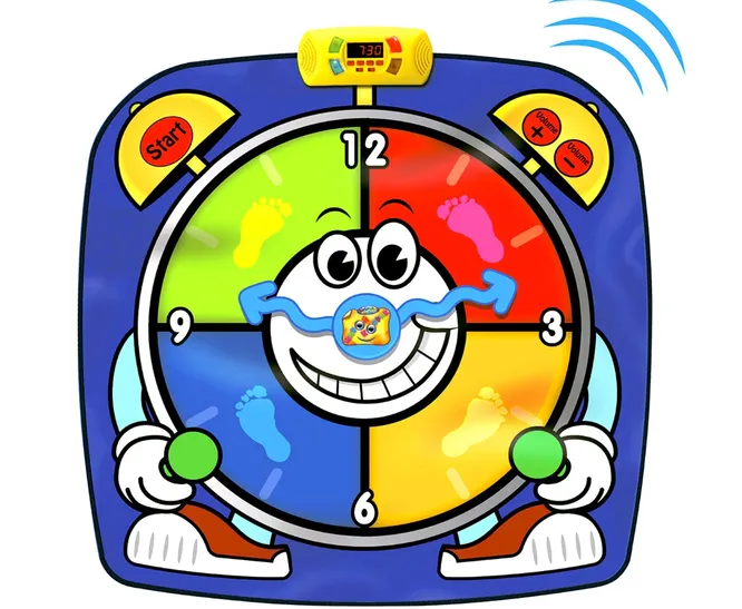 Вариация игры «Мемори» – тоже на развитие реакции и внимания ребенка, но есть большое отличие. Работать нужно не руками, а ногами. Игра в «Веселый будильник» заключается в том, чтобы успеть наступить на те части коврика, где загорается сигнальная лампочка. Предусмотрено три уровня сложности – в первых двух поочередно загорается одна лампочка с различным временным интервалом. А на третьем малышу придется изрядно потрудиться – одновременно могут загореться две лампочки. Этот подарок вмещает функцию и настоящего будильника, так что 3-летний ребенок научится просыпаться в детский сад вместе с ним. А с утренней разминкой на таком коврике легко зарядиться положительной энергией на целый день.