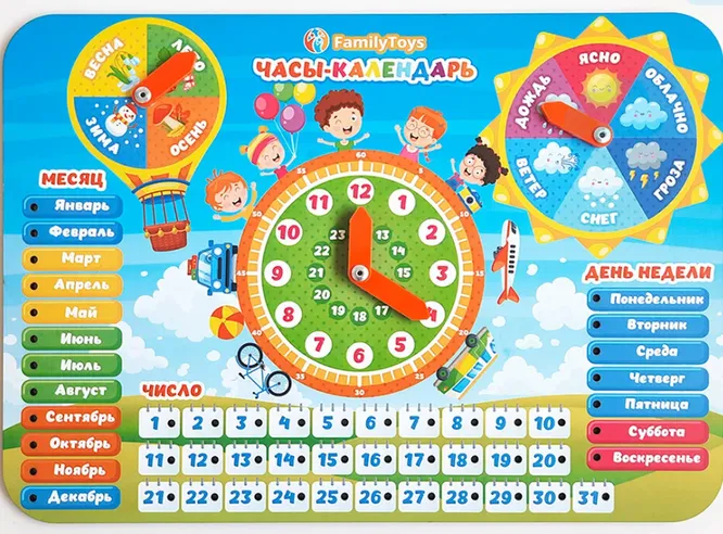 Обычно дети начинают понимать время по часам в возрасте от 5 до 7 лет. Но это не мешает готовить ребенка к знакомству с этим понятием раньше. Главное, привлечь его внимание ярким и занимательным предметом и доносить информацию в ненавязчивой игровой форме. Удачным подарком из этой категории для 3-летнего ребенка станет обучающая игра. В детском календаре несколько зон: часы, числа, дни недели, месяцы, явления погоды и времена года. На доске есть кнопки, указатели и стрелки. В процессе изучения задействуется зрительная память, поэтому усвоить новые знания малышу будет проще. А еще в течение дня девочке или мальчику нужно давать задания, чтобы он показывал указанные родителями час, день недели и число. Кстати, благодаря второму циферблату ребенок научится определять время и на электронных часах.
