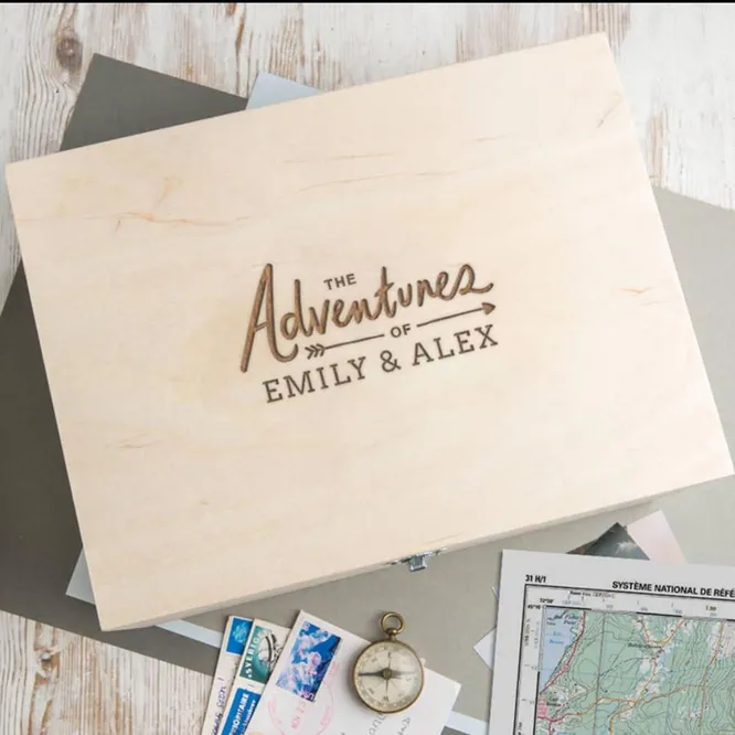 Подари ей деревянную шкатулку с вашими именами. Туда вы сможете складывать и хранить авиабилеты, открытки из путешествий и другие мелочи.