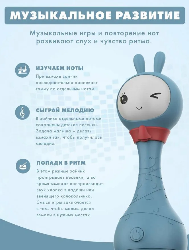 «Медовый зайка» — одна из самый популярных игрушек, и это неслучайно. Во-первых, она станет другом ребенку на много лет – с рождения и до школы, а то и дольше. Во-вторых, она многофункциональна: зайчик и песенку споет, и сказку расскажет, и в качестве светильника может использоваться, и в качестве прорезывателя зубов. Он поможет заснуть и повторит за ребенком сказанное. Кроме всего прочего, зайка может использоваться как Bluetooth-колонка. Игрушка безопасна, заряжается от USB, изготовлена из прочных и безопасных материалов, мило выглядит – чего еще можно пожелать?