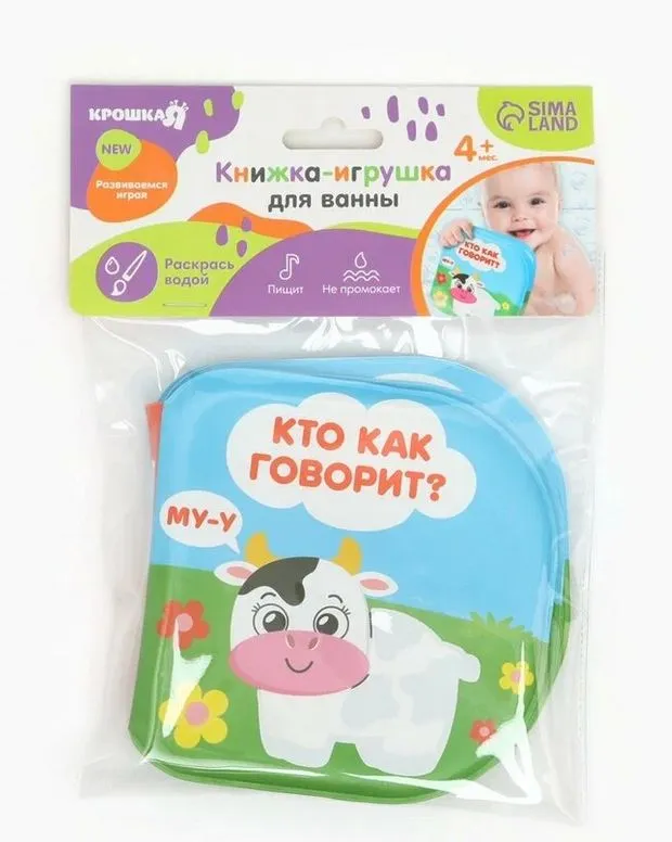 Для взрослых принятие ванны – обычная гигиеническая процедура или способ расслабиться после тяжелого дня, а для малыша это целое приключение. Годовалые дети в массе своей любят плескаться в ванной и играть в воде с игрушками. Книжка-игрушка станет отличным подарком для малыша старше 4 месяцев. Она изготовлена из безопасного материала, и не боится влаги. Малыш может раскрашивать картинки мокрыми пальчиками: от контакта с водой рисунки станут разноцветными. Книжка состоит из 8 страниц с обучающими картинками. Предусмотрены и звуковые эффекты.