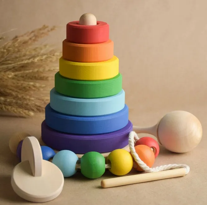 Набор развивающих игрушек из натурального дерева можно использовать с двухмесячного возраста, но особенно интересным он будет для детей, которые уже умеют сидеть. Поначалу для освоения новых навыков потребуется помощь родителей, но затем малыш научится собирать пирамидку самостоятельно. И с ней, и с другими игрушками из набора можно придумать множество интересных развивающих игр. Игрушки изготовлены из экологически чистого дерева, окрашены безопасными красками, не имеют острых граней и углов, а нежные оттенки помогут развить цветовосприятие и не напугают даже самых маленьких.
