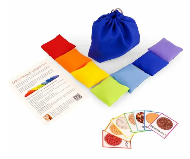 Игрушки для малышей условно можно поделить на предназначенные для самостоятельного развлечения и для совместных развивающих игр-занятий. Сенсорные мешочки относятся ко второй категории. Родители, практикующие методы Марии Монтессори, смогут с их помощью заниматься с малышом, учить его сравнивать предметы с учетом разных параметров, развивать память, внимание и воображение. В комплект входят мешочки 8 на 8 см, сшитые из приятного на ощупь габардина с различными наполнителями (фасолью, макаронами, горохом, каштанами, песком, гречневой лузгой, каштанами, холофайбером), а также двухсторонние карточки с заданиями, инструкция с подборкой из 11 игр и тканевая сумочка для хранения.