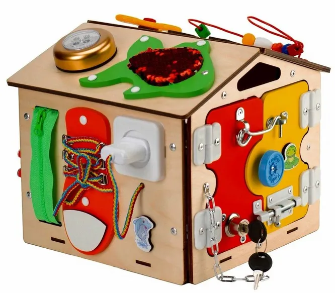 Бизиборды представляют собой игрушки для самых маленьких в виде доски с различными элементами для развития сенсорного восприятия. Текстурные поверхности и всевозможные головоломки для самых маленьких способны занять малышей на долгие часы. Представленная разновидность отличается от других бизибордов компактными размерами: она сделана в виде домика, каждая стена и даже крыша которого украшены различными по сложности элементами. С какими-то из них малыши справялся еще до достижения года, а какие-то освоят лишь со временем. Дверки, шестеренки, фонарик, спиннер, крючок, щеколда и даже настоящий замок с ключом, лабиринты, шнуровка, застежка-молния, розетка и многое другое подойдут для развития мелкой моторики, логического мышления, воображения. Игрушка наверняка станет любимой у ребенка в ближайшие годы – отличная идея для подарка.