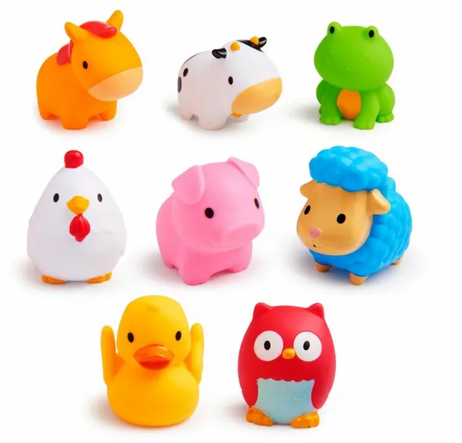 Набор из 8 симпатичных игрушек-брызгалок обязательно понравится малышу. Яркие игрушки имеют удобный размер и форму, развивают мелкую моторику, легко моются и чистятся, подходят для создания пузырей и в качестве брызгалок, а также пищат. Их можно использовать и для развития ребенка: изучать цвета, названия домашних животных и птиц. Подойдет набор и для использования «на суше» — например, с ним можно разыгрывать сценки из жизни на ферме.