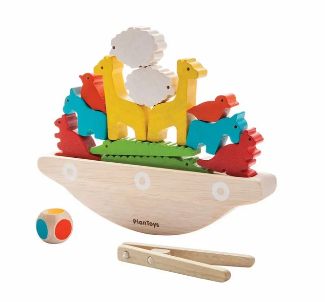 Игрушка-балансир развивает логику, внимание, усидчивость и мелкую моторику. Играть можно как в компании до 4 человек, так и в одиночестве. Поначалу потребуется помощь родителей, но в дальнейшем малыш сможет развлекать себя самостоятельно. Сначала нужно бросить кубик, чтобы определить цвет животного, которое ляжет в основании композиции, а потом с помощью деревянного пинцета (как и кубик, входит в набор) по очереди пристроить в лодке всех животных. Игра закончится, как только конструкция обвалится. Также можно использовать фигурки для любых других игр: они изготовлены из гладкого каучукового дерева, не имеют острых граней, окрашены нетоксичными красками.