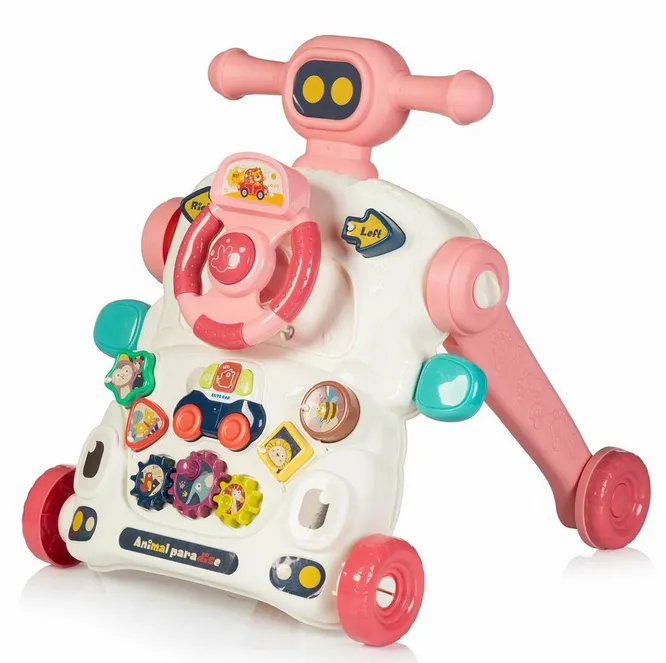Предлагаем обратить внимание на эту игрушку-каталку, которая по совместительству является еще и игровым центром. Ее передняя часть снимается и превращается в бизиборд или игровой столик с множеством развлечений – шестеренками, счетами, пианино, баскетбольной корзиной, кнопками разных размеров и форм. Малыш может играть сидя или стоя, а когда придет время учиться ходить, использовать каталку в качестве дополнительной опоры. В отличие от других моделей ходунков эта разновидность не оказывает негативного влияния на координацию движений и равновесие. Игрушка изготовлена из прочного безопасного пластика и подходит детям от 9 месяцев.