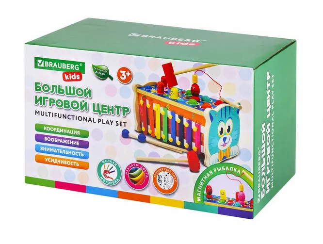 Игровой набор приведет в восторг любого малыша. Нам понравился этот компактный игровой центр, который можно использовать с трех месяцев. Он имеет все шансы стать любимой игрушкой, которая будет развлекать ребенка в течение нескольких лет. Ксилофон, магнитная рыбалка, сортер с разноцветными шариками, пчелка-трещалка, игра с молоточком и барабан – сразу несколько увлекательных игр в одном наборе. Все предметы изготовлены из натурального дерева и безопасны. Игровой центр развивает координацию движений, музыкальный слух, мышление и ловкость, помогает научиться различать цвета и считать. И просто развлекает, конечно.
