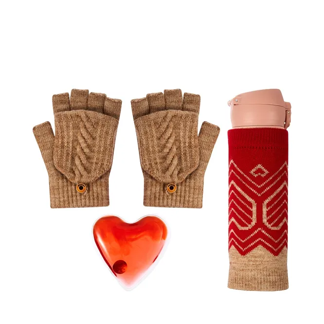 Милый набор — в нем митенки, термос для горячих напитков и грелка для рук. Согревает сердце!