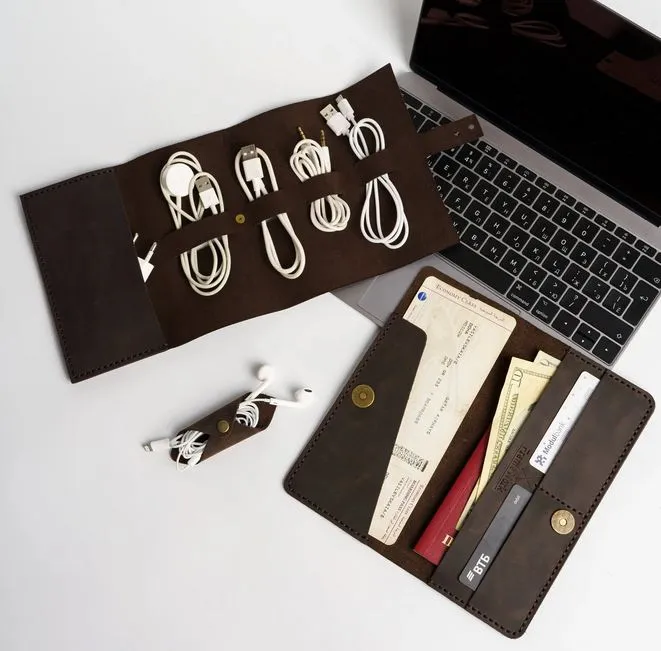 Отличный набор для тех, кто путешествует по делу и хочет выглядеть представительно. Тревел-холдер удобно использовать для хранения паспорта, билетов, банковских карт и купюр. Органайзер для проводов поможет держать в порядке многочисленные проводки и зарядные устройства. Оба изделия выполнены вручную из матовой кожи благородного шоколадного оттенка. В качестве подарка к ним прилагается держатель для проводов и наушников. Такой подарок не стыдно подарить даже самому придирчивому путешественнику.