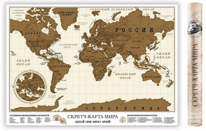 Настенная карта мира станет отличный подарком путешественнику. Посетив новую страну, нужно стереть скретч-слой на соответствующем участке карты. Путешествия превращаются в интересную игру: чем больше поездок, тем ярче карта! Она станет отличный декором и для дома и для рабочего кабинета, а также поможет легко визуализировать прошлые поездки и спланировать новые.