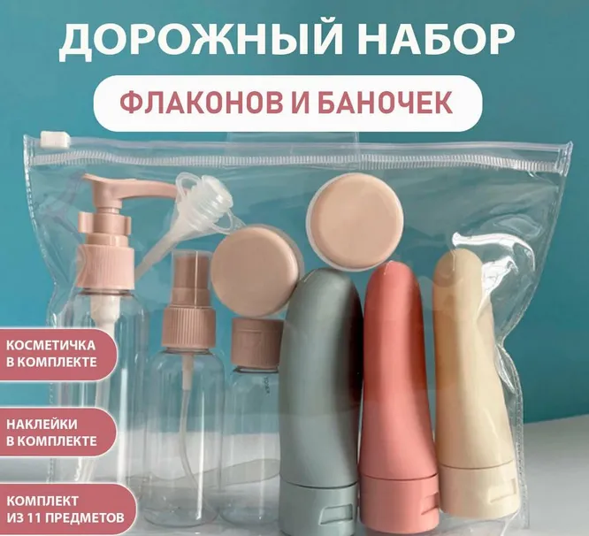 Такой набор пригодится и для похода в спортзал, и для поездки на дачу, и для больницы, а в авиапутешествиях он и подавно незаменим. В набор входят прозрачная косметичка, 6 бутылочек, 2 баночки, пипетка, воронка и лопаточка, а также прозрачные наклейки. Все емкости имеют объем менее 100 мл, а значит, их можно брать в ручную кладь. Изделия изготовлены из безопасного пластика, легко моются и герметично закрываются, пользоваться ими просто и приятно.