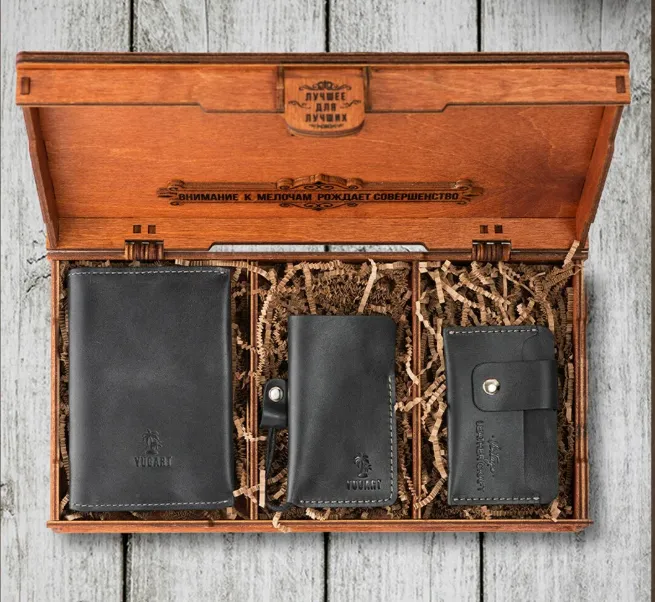Выполненные в едином стиле атрибуты делового человека работают на имидж своего владельца и добавляют гармонии всему образу. Поэтому подарить мужу, папе, коллеге или брату набор гораздо выгоднее. Аксессуары из натуральной кожи смотрятся солидно, а ключница и картхолдер давно признаны удобными и полезными изобретениями. Обложка на паспорт идет в комплекте, и все предметы упакованы в симпатичный бокс с пожеланием. Тот случай, когда все продумано до мелочей, остается лишь вручить и наслаждаться эмоциями получателя.