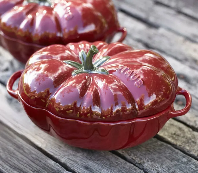 С такой посудой нужно соблюдать осторожность, потому что она имеет свойство захватывать кухню владелицы, стоит впустить в нее хотя бы одну вещицу. Помидорная серия кокотниц конкурирует с тыквенной, но здесь дело исключительно вкуса. Изысканную керамическую посуду можно подарить маме, сестре, подруге или семейной паре на Новый год. Это не просто функциональная посуда, а настоящий предмет коллекционирования. Кокот выполнен из высококачественной керамики с фарфоровой отделкой, поэтому она идеальна для запеканок, жареных блюд и других кулинарных изысков. Эффектный дизайн позволяет ей становиться элементом сервировки, добавляя столу красок и оригинальности.