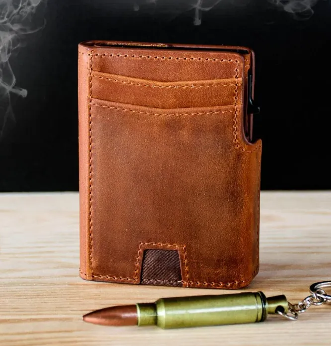 Аксессуар несет не только полезную функцию, но еще является частью образа мужчин (и женщин тоже). Кошелек выполнен в стиле crazy horse, напоминающем потертости на старой амуниции для лошадей. Натуральный материал подчеркивает статус и индивидуальность владельца, такая кожа устойчива к повреждениям и «стареет красиво», приобретая со временем благородный налет. Практичности подарку для мужчины добавляет выкидной механизм, позволяющий быстро и легко доставать купюры. Поклонники винтажного стиля оценят презент.