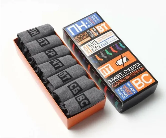 Шутки про сортировку носков и их выбор в качестве подарка мужчине по любому поводу мы вспоминать не будем, потому что изделия из представленного набора – вещь абсолютно серьезная. Во-первых, в наборе целых семь пар! А во-вторых, лаконичная надпись говорит сама за себя и облегчает жизнь мужу (и жене) при поиске второго носка. Уверены, вы оба оцените всю практичность презента и обойдетесь без сарказма. Кстати, такие не стыдно преподнести и другу, и коллеге – они тоже заботу оценят.