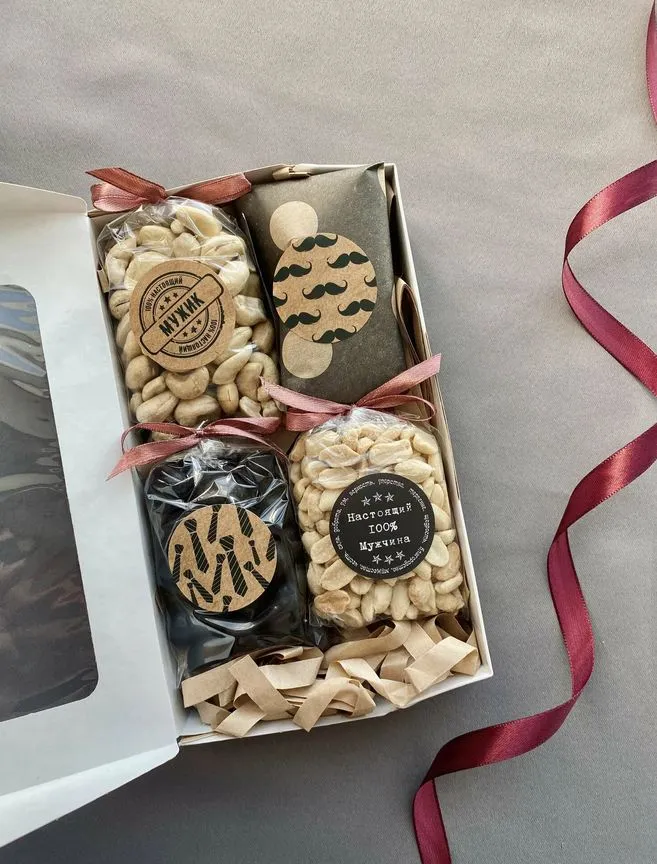 Хотя многие парни любят сладости, орешки они любят еще больше. Что ж, отлично, тогда мы нашли прекрасный бюджетный подарок для любого мужчины — набор орехов + печенье с предсказанием. Красивая упаковка перевязана ленточкой и отлично подойдет для любого праздника.