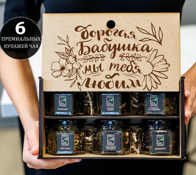 Не можешь придумать, что подарить бабушке на 500 рублей, чтобы подарок одновременно был приятным и полезным? Вот отличная идея — набор чая в красивой коробке с теплой надписью. В наборе представлены различные сорта качественного листового чая с сухофруктами, цветочными лепестками, цедрой, ягодами и травами. А теперь самое главное: послу вручения такого подарка не забывай регулярно забегать к бабушке в гости на чашечку ароматного чая!