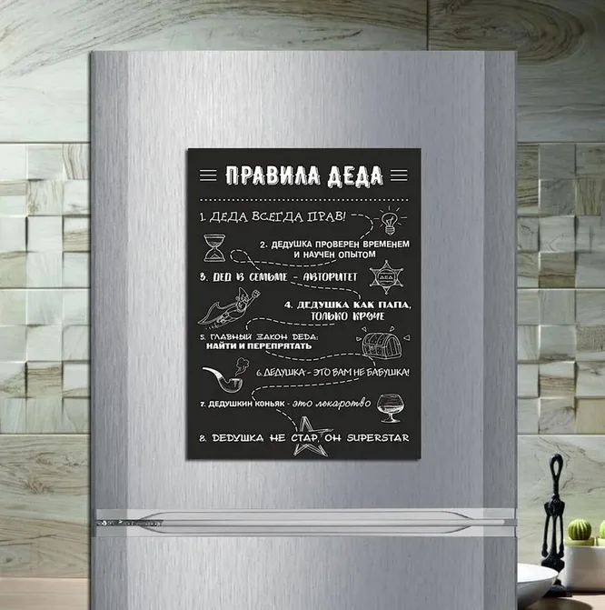 Магнит на холодильник — так себе идея для подарка, но не в этом случае! Такой магнит с правилами, согласно которым дедушка всегда прав, наверняка понравится получателю этого символического бюджетного подарка. Но только иди до конца и не забывай соблюдать эти правила!
