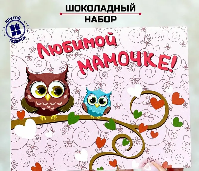 Шоколадный набор — классический подарок, которому обрадуется любая женщина. Мы же предлагаем выбрать набор, который предназначен специально для мам. В него входит 12 шоколадок, на каждой нарисована милая сова и написан искренний комплимент. Недорогой подарок обрадует маму, мы уверены в этом.