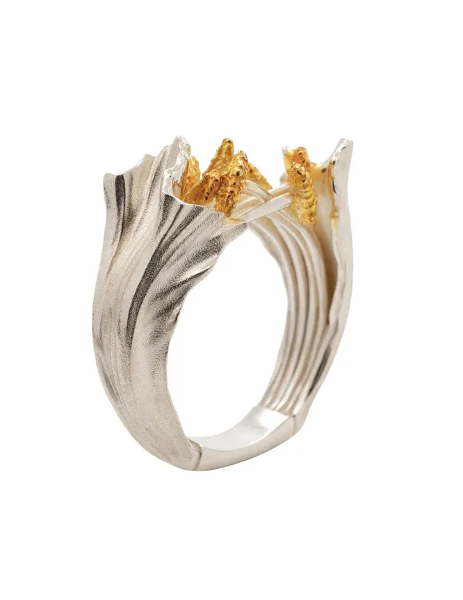 Эффектное серебряное кольцо с отделкой родием и золотом понравится даже тем, кто равнодушен к украшениям. Оно идеально дополнит повседневные, деловые и вечерние образы.