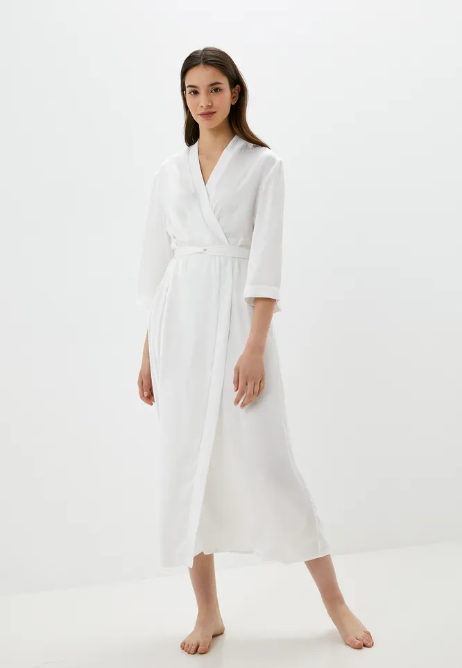 После сна или душа ей будет приятно укутаться в этот нежный шелковый халат белоснежного цвета. Он красиво обрамляет фигуру, дарит чувство полного комфорта и уюта.