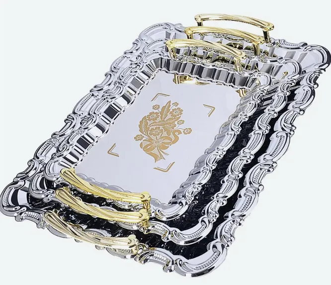 Пара, в которой готовка превращается в увлекательное занятие, а подача блюд – в маленький шедевр, оценит презент из этой серии. Подносы сделаны не из серебра, но соответствующий цвет делает набор актуальным для подарка на серебряную свадьбу. Изделия изготовлены из нержавеющей стали с зеркальной полировкой, поэтому будут служить хозяевам долгие годы, превратившись в главный аксессуар классной сервировки. Они отлично подойдут для подачи мясных и рыбных блюд, но даже простая нарезка из овощей, колбасы и сыра будет выглядеть на них более аппетитно и эстетично. Благодаря оригинальному дизайну сервировочные подносы займут достойное место на кухне и придадут элегантный вид обеденному столу в будни и праздники. Еще рассмотри идею покупки складного столика-подноса, удобного для завтраков, посиделок на полу или на природе у костра.