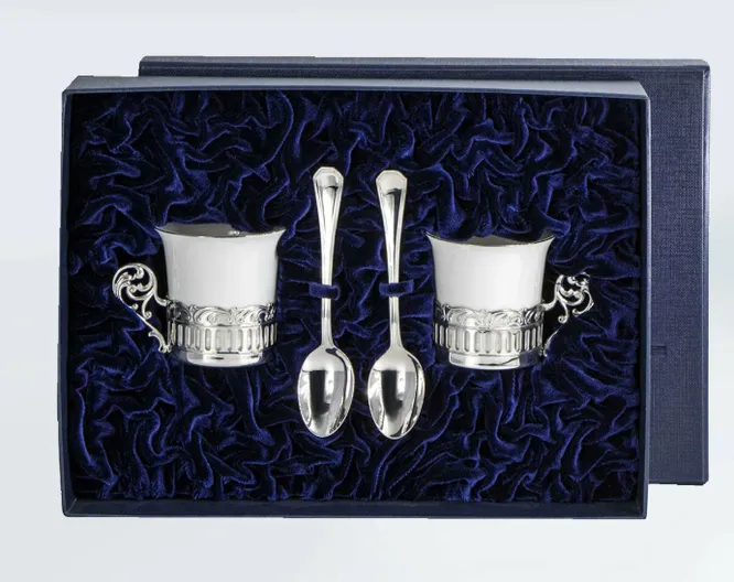Традиционный способ поздравить пару с 25-й годовщиной – выбрать сувениры или столовые приборы из серебра. Такой сюрприз влетит в копеечку, поэтому на серебряную свадьбу можно сделать общий подарок от родственников или друзей. Либо присмотреться к небольшому набору для кофе. Он состоит из пары чашек с ложками, изготовленных из серебра 925 пробы и фарфора. Роскошный футляр избавляет от необходимости продумывать оформление – в нем презент смотрится особенно стильно и дорого.