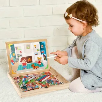 Маленькие девочки и мальчики невероятно активны, их трудно занимать одним делом подолгу, поэтому родители особенно ценят многофункциональные игрушки. Одна вещь объединяет несколько, как магнитная доска для рисования и игр. Практичный и занимательный вариант подарка детям на Новый год в детский сад. В комплекте двусторонняя доска: на одной стороне можно рисовать маркерами и крепить магниты, а на другой – орудовать мелом. Все эти предметы прилагаются в чемоданчике. Таким образом ребенок получает несколько десятков игр, среди которых развитие умения описывать внешность людей и их увлечения, сравнивать предметы и тренировать логику.