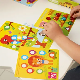 Вероника: «Полезная игра для детей, они учатся различать цвета и запоминать их. Отдельное спасибо за удобную коробочку, можно разделить каждый цвет в свой отсек. Карточки двухсторонние. Мой мальчик также любит просто лежать и перебирать камешки в руке, они приятно звучат при столкновении».