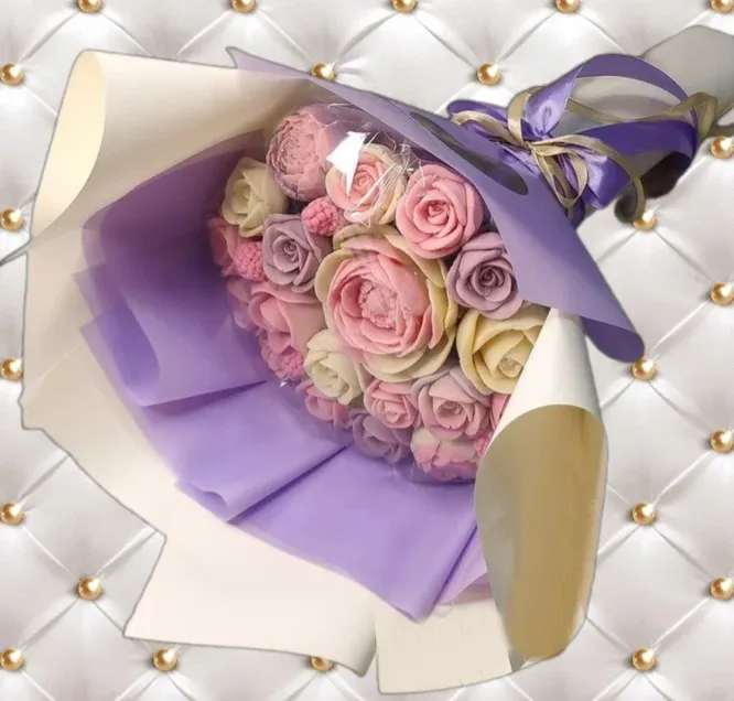 Светлана: «Отличный букет! Вкусный и нарядный! Очень необычный подарок. Сначала именинница подумала, что цветы настоящие, а потом долго не решалась попробовать, было жалко красоту)) Но не устояла и нас угостила. Шоколад нежный, не приторный».