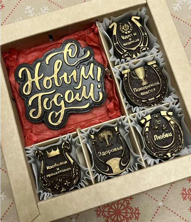 Дарить символ года – старая добрая традиция, которая пришла к нам из китайской культуры. Она выражает пожелания благополучия, достатка, удачи. Только вместо ненужных статуэток и календариков предлагаем подарить воспитателю на Новый год ассорти из конфет ручной работы. На фигурных подковах, выполненных из темного шоколада, написаны пожелания – достойная и оригинальная альтернатива банальным открыткам. И получатель встретит год Красной Огненной Лошади с самым вкусным символом на своем столе.